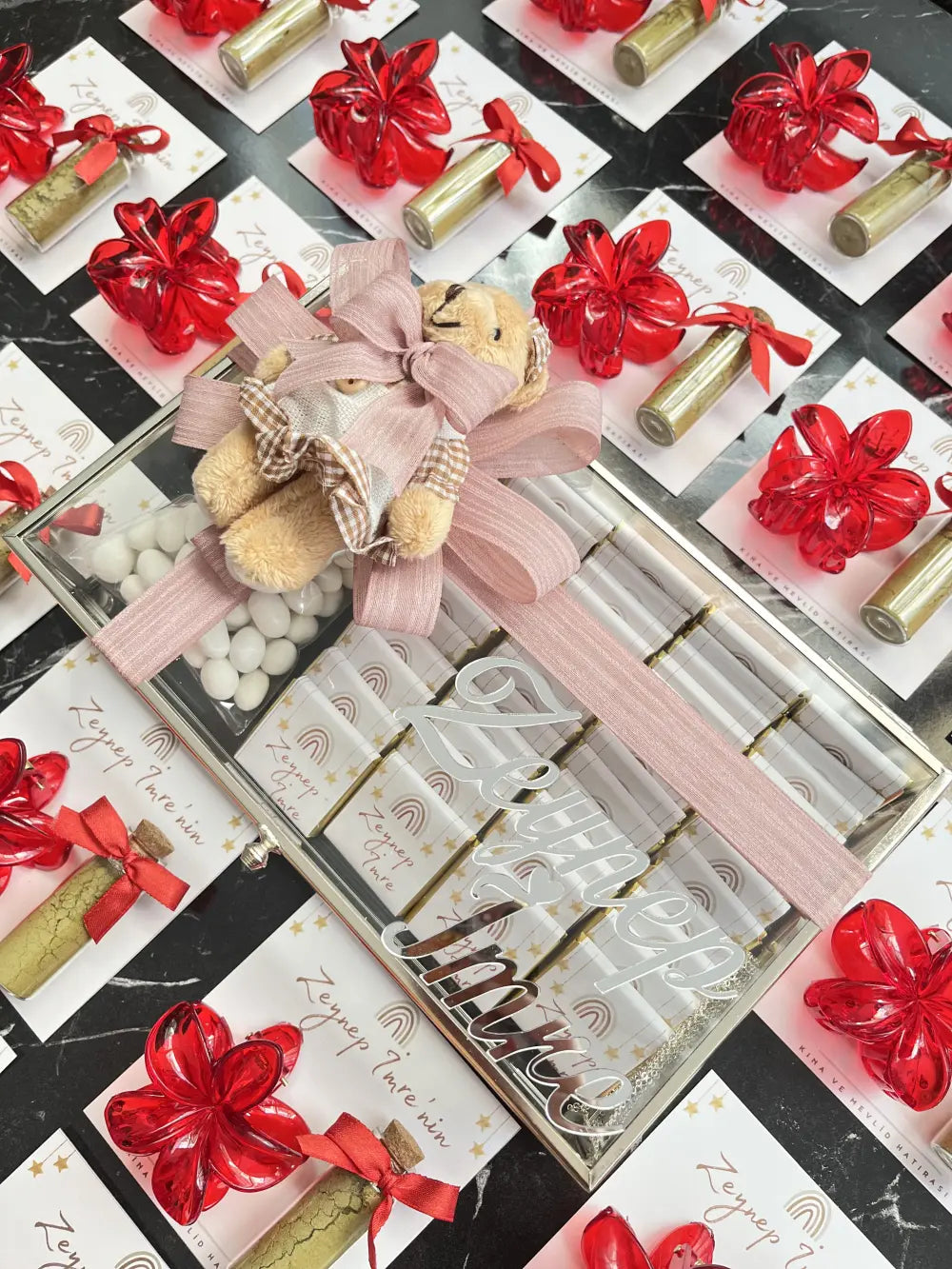 Cam Çikolata Kutusu - Badem Şekerli - Ayıcıklı Kız Bebek Süslemeli